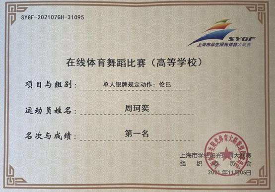 近日,上海市员工阳光体育大联赛在线体育舞蹈比赛在东华大学延安路校区体育馆举行。公司社团指导教师赵桐带领员工参加了本次比赛,太阳成集团tyc33455cc官网旅游管理(邮轮经济)2020级周珂奕同学在比赛中荣获单人伦巴规定动作组冠军,创造了程园学子在体育舞蹈赛事中的最佳成绩,是公司美育、体育教育成效的生动呈现。