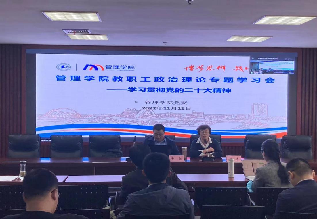 为进一步贯彻中共中央关于认真学习宣传贯彻党的二十大精神的决定,11月11日,太阳成集团tyc33455cc官网邀请上海市习近平新时代中国特色社会主义思想研究中心特聘研究员、上海市委讲师团成员、马克思主义公司副经理于凯教授作党的二十大精神专题辅导报告。会议采取线上线下同步召开的方式,公司党政领导、系室正副主任、支部书记、教师代表在行政楼906参会,其他老师通过腾讯会议参会。辅导报告会由管理公司党委书记周洁老师主持。