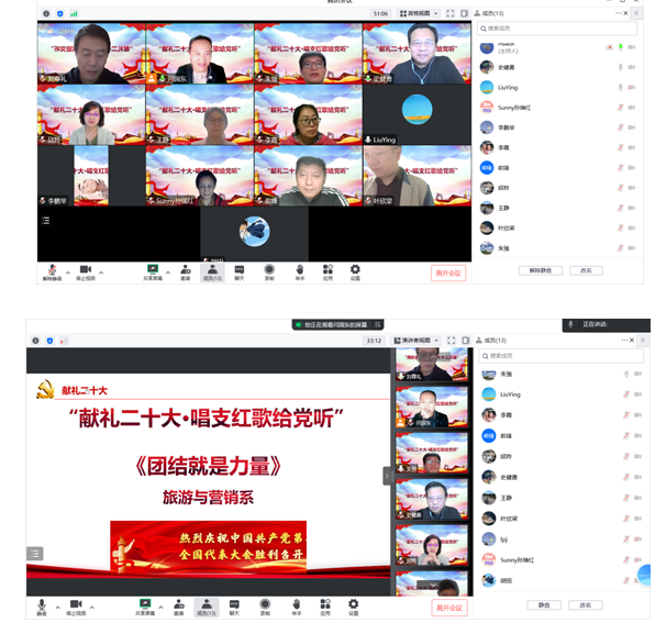 旅游与营销系工会小组特邀请其党支部成员公司党委副书记、校工会主席史健勇老师共同演唱《团结就是力量》,教师们感受到中国共产党那段不平凡的岁月里迸发出的强大力量;