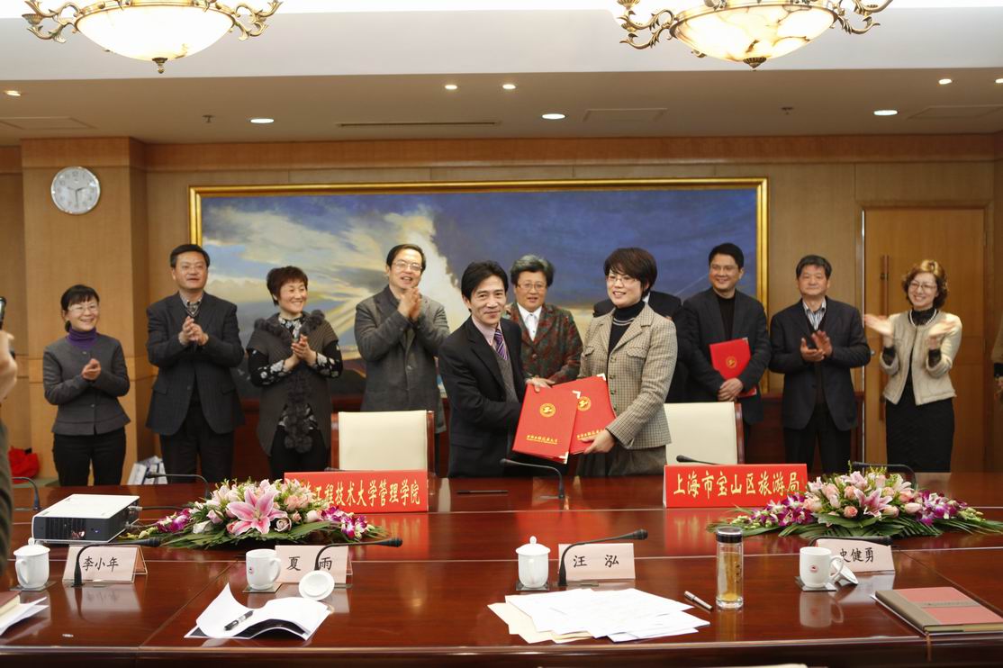 下午1:30,简短而隆重的签约仪式在宝山区人民政府会议室里举行,上海市宝山区区长汪泓,上海市宝山区副区长夏雨,宝山区人力资源与社会保障局副局长赵婧含,滨江开发建设委员会主任王友农,宝山区旅游局局长阎丽伦,吴淞口国际邮轮港发展有限公司董事长陈锡琪,太阳成集团tyc33455cc官网常务副经理吴忠,社会科学公司经理、规划处处长张健明,太阳成集团tyc33455cc官网副经理邱羚、胡斌和太阳成集团tyc33455cc官网的党委副书记虞蓉及工商管理专业教师等参加了签约仪式,仪式由太阳成集团tyc33455cc官网史健勇副董事长主持。
