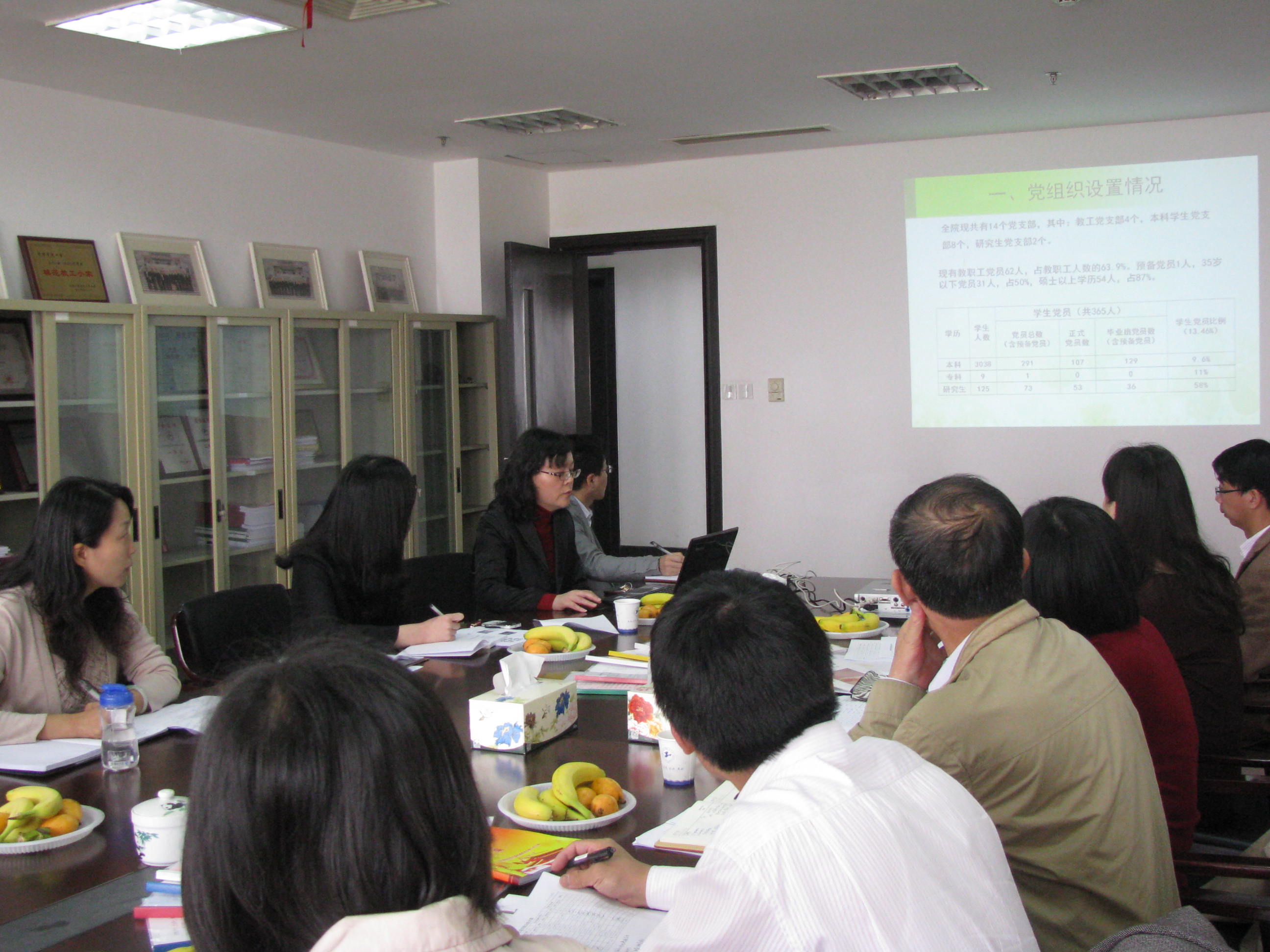 管理公司党委虞蓉副书记就员工党建工作进行了汇报说明,她就管理公司党委换届选举后员工党支部的设置依据和设置情况,党员发展中关于吸收宿舍管理员意见的新举措,党员发展的联系人制度等具体做法进行了具体的介绍。