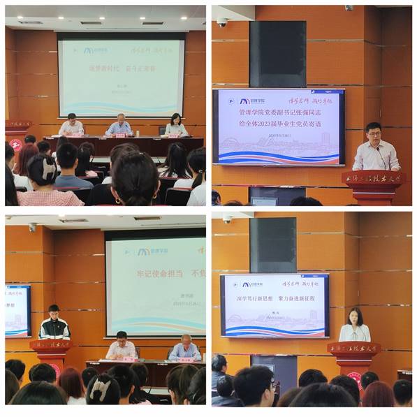 随后唐书清同志作为2023届研究生党员代表做了“牢记使命担当,不负青春梦想”的发言,他强调了牢记使命担当和不负青春梦想的重要性,鼓励同学们在今后的工作和生活中时刻保持对党的忠诚和为人民服务的初心。魏南同志作为2023届本科生党员代表做了“深学笃行新思想,聚力奋进新征程”的发言。她跟所有毕业生党员分享了三点在读大学本科的感悟:多行动少迷茫;不要和别人比较;要学会感恩。她鼓励同学们要不断学习新知识,坚定信仰,并勇于面对挑战,为实现个人的理想和国家的发展贡献自己的力量。