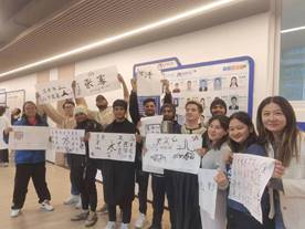 经过短暂的练习后,大家都跃跃欲试,开始完成自己的比赛作品。令我们感到惊奇的是,除了为本次活动临摹所收集的《陋室铭》等中国传统诗句和名言,同学们还自行搜索,寻找其他的中国著名诗句并进行临摹和创作。在轻松愉快的氛围当中,大家的灵感再次迸发,不仅用毛笔这一中国传统书写工具来书写中国字,还将自己祖国家乡的字也带到了宣纸上,并以集邮的方式收集来自不同国家地区的同学的签字,就这样一张张带有各国不同语言的毛笔字书法作品诞生了。