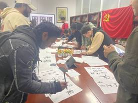 After a short practice, everyone was eager to try and start their competition works. To our surprise, in addition to the traditional Chinese poems and famous sayings collected for this activity, such as An Epigraph in Praise of My Humble Home, the students also searched for other famous Chinese poems by themselves and copied and created them. In the relaxed and pleasant atmosphere, everyone's inspiration burst out again, not only with the brush, a traditional Chinese writing tool, to write Chinese characters, but also with their own hometown characters on the rice paper, and collect the signatures of students from different countries and regions in the way of philately, so that a piece of calligraphy with different languages of different countries was born.